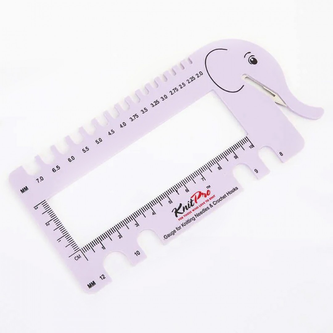 Шкала від виробника KnitPro у вигляді милий слоник, яка допомагає визначити розмір спиць для в'язання. Також вона працює як вимірювальний інструмент для визначення щільності в'язання та висоти ряду.
