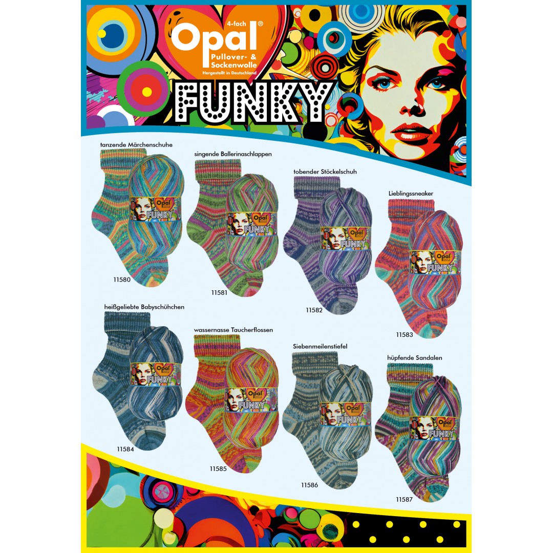 Opal Funky – класична шкарпеткова пряжа німецького виробника Opal – додає кольору, веселощів та нотку химерності вашим спицям. Завдяки яскравим кольорам та грайливим візерункам, пряжа для шкарпеток Opal Funky гарантовано підніме вам настрій під час в'язання та носіння шкарпеток. Ідеально підходить при сірій погоді за вікном, коли хочеться додати яскравих барв.