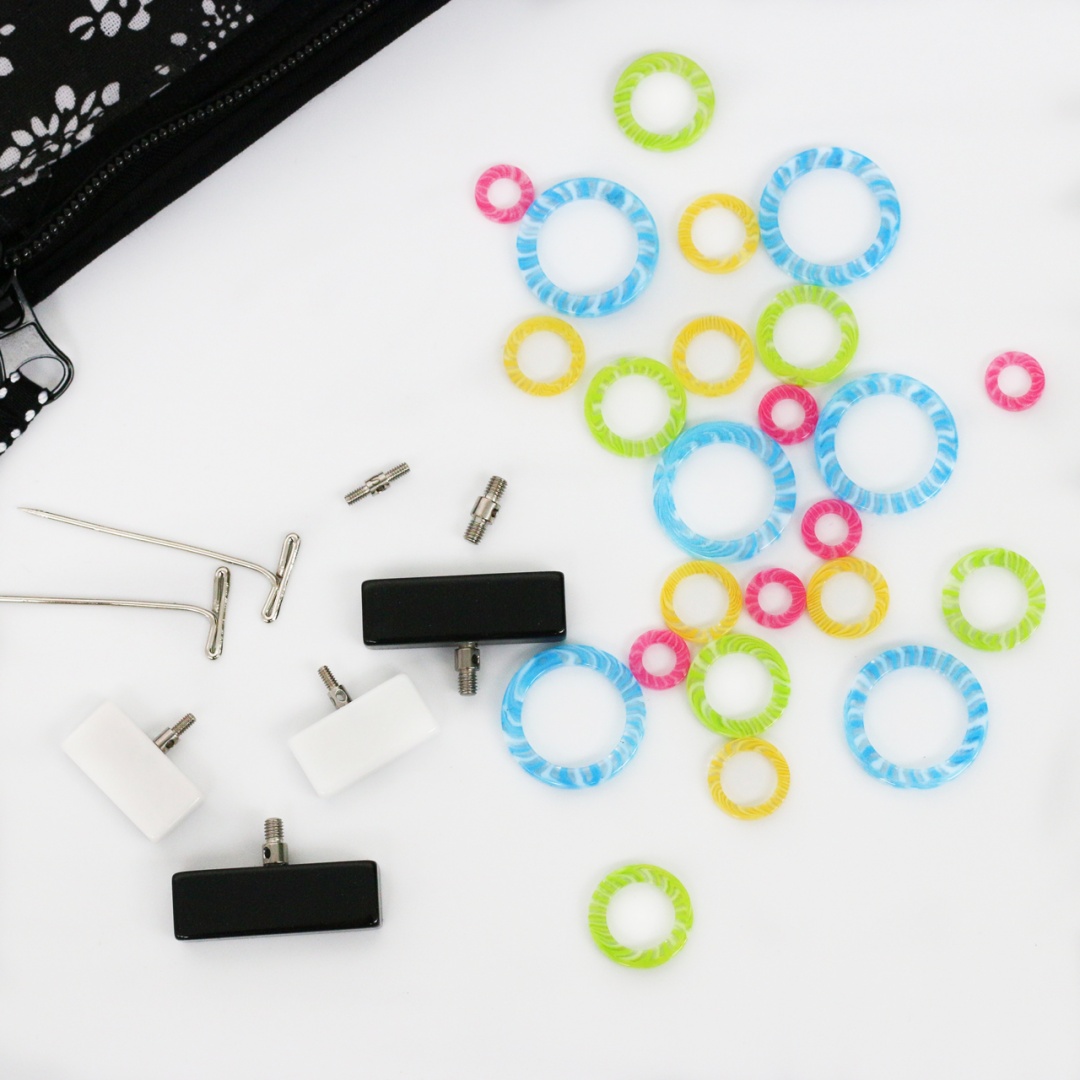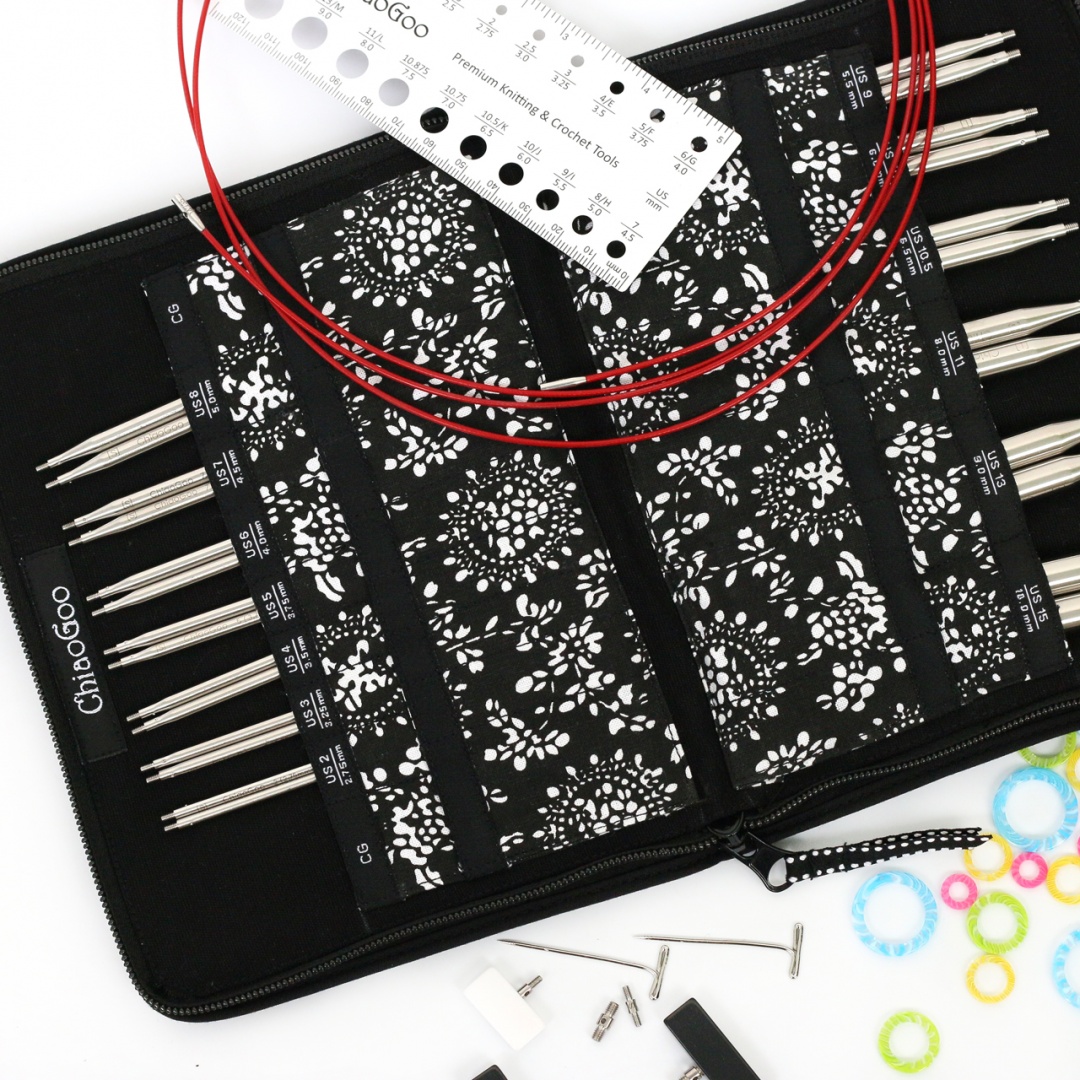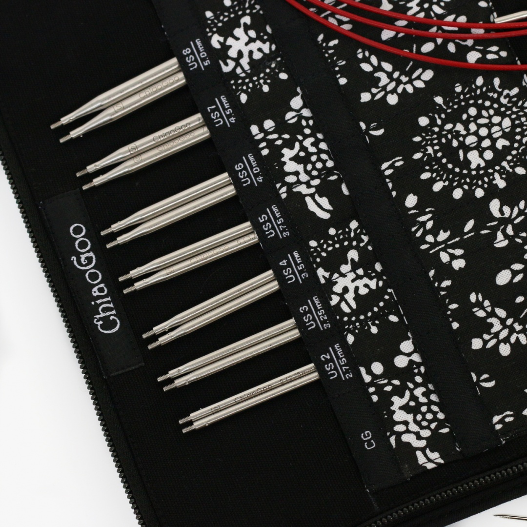 Розміри: 2,75 мм, 3,25 мм, 3,5 мм, 3,75 мм, 4 мм, 4,5 мм, 5 мм, 5,5 мм, 6 мм, 6,5 мм, 8 мм, 9 мм, 10 мм; - 3 Small и 3 Large змінних кабелі, що не мають пам'яті, довжиною: 35, 55 і 75 см. З їх допомогою можна сформувати кругові спиці довжиною 60, 80 і 100 см (разом з довжиною спиць 13 см). Вони складаються з багатожильного сталевого троса, покритого червоним нейлоном;