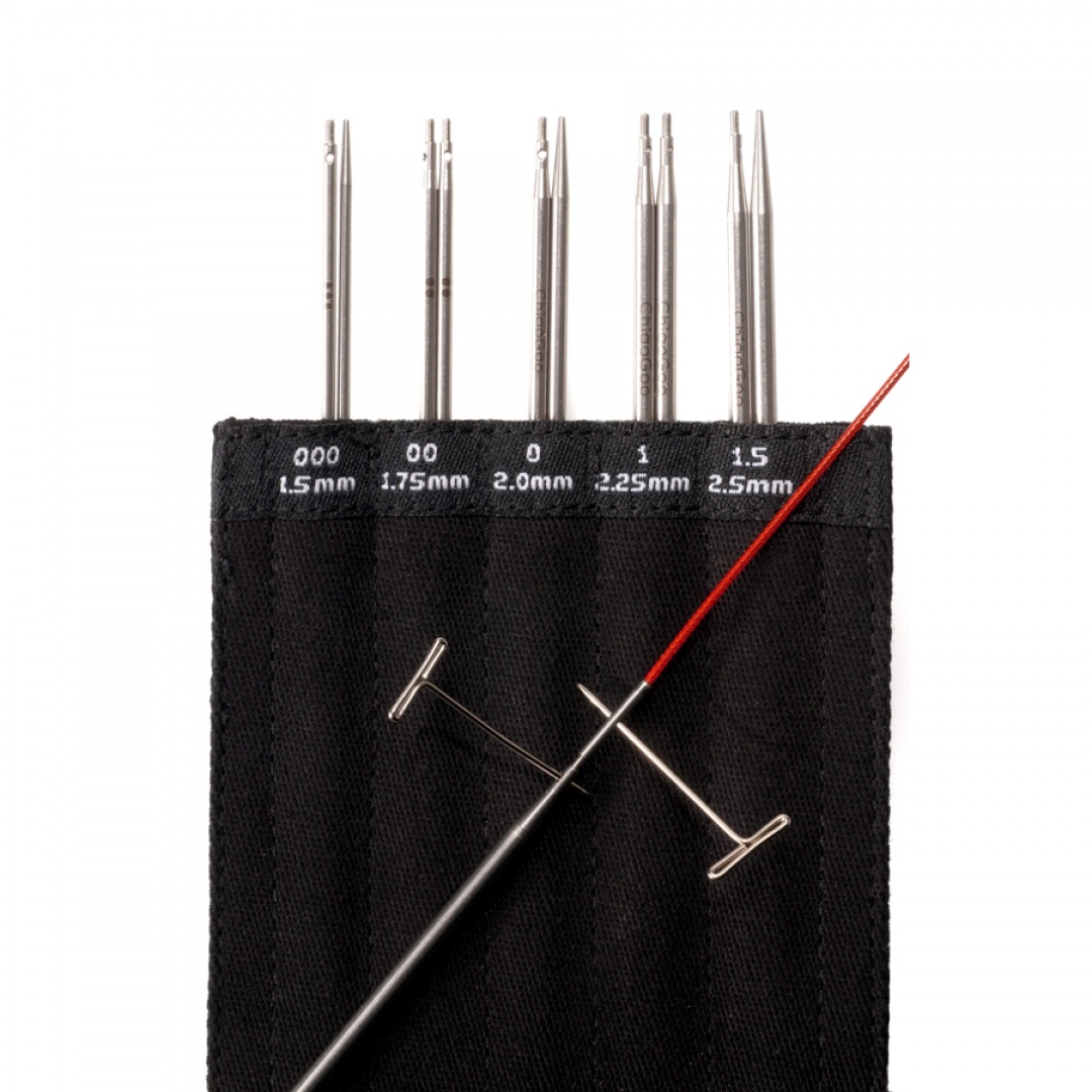Размеры: 1,5 мм, 1,75 мм, 2 мм, 2,25 мм, 2,5 мм; - 3 сменных кабеля Twist Red Mini, не имеющих памяти, длиной: 20, 35 и 55 см. С их помощью можно сформировать круговые спицы длиной ≈ 40, 60 и 80 см (вместе с длиной спиц 10 см). Они состоят из многожильного стального троса, покрытого красным нейлоном;